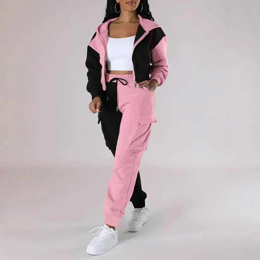 Conjunto de dos piezas Sudadera con capucha, cremallera, pantalones cargo con cordón.