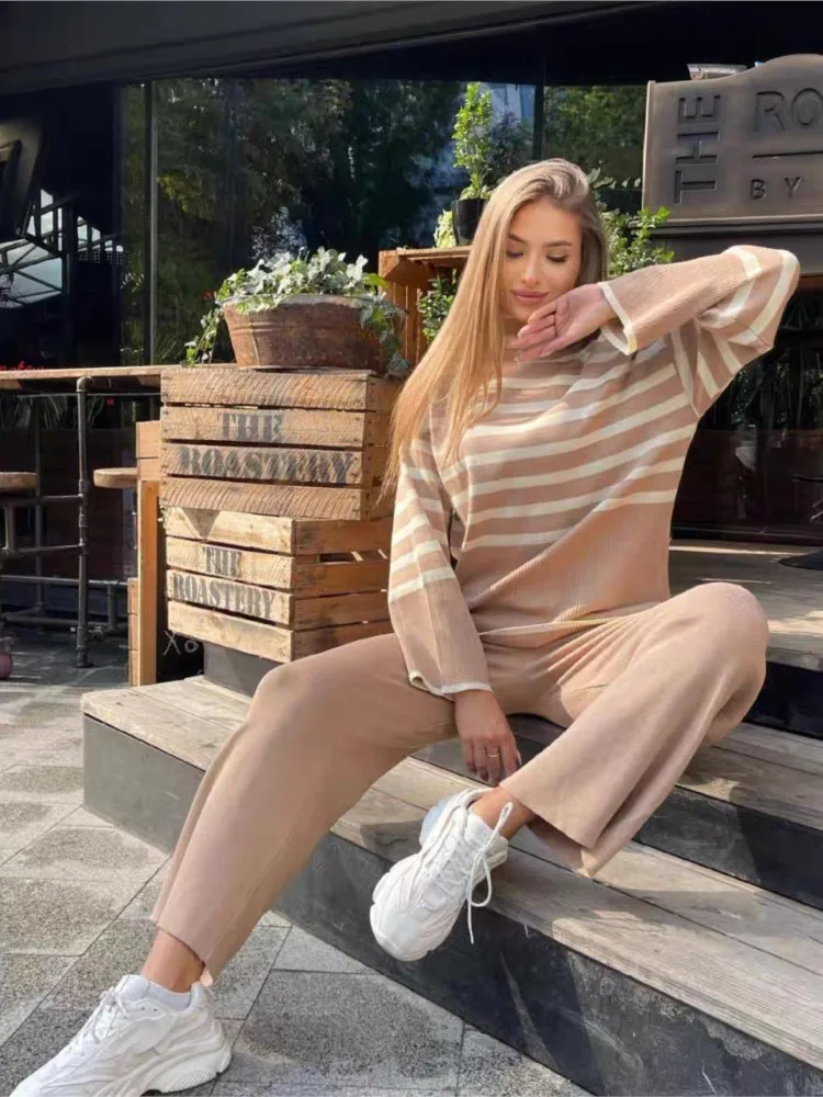 Conjunto de dos piezas suéter de cuello alto arrayas, holgado, pantalones holgados.Conjunto de dos piezas suéter de cuello alto arrayas, holgado, pantalones holgados.