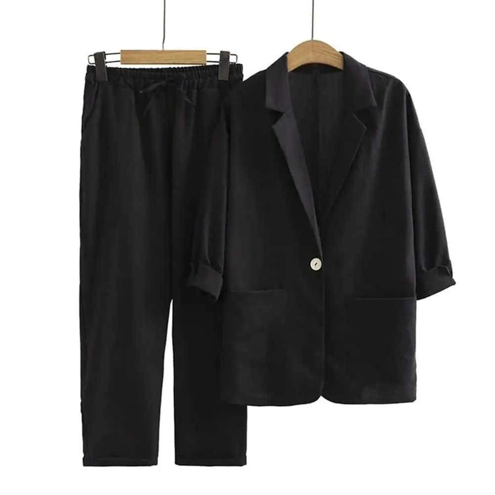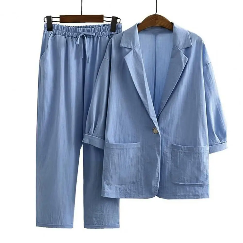 Conjunto de traje de 2 piezas de algodón y lino chaqueta y pantalones sueltos.
