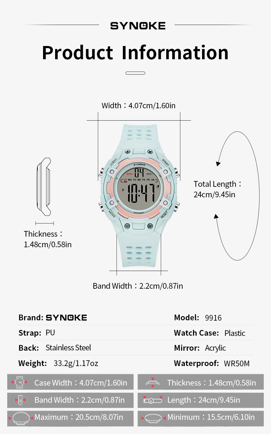 - Característica: Cronómetro, Luz de fondo, Resistente a los golpes, Calendario completo, Resistente al agua, Alarma, Nadar, Visualización de la semana