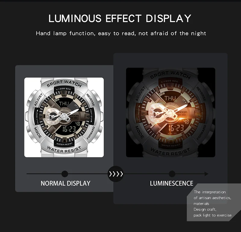 Diámetro del dial50 mm y másCaracterísticaRELOJ DE STOP, Luz de fondo, Resistente a golpes, Pantalla LED, Luminoso, Fecha automática, Cronógrafo, IMPRESIÓN, Resistente al agua, Alarma, natación