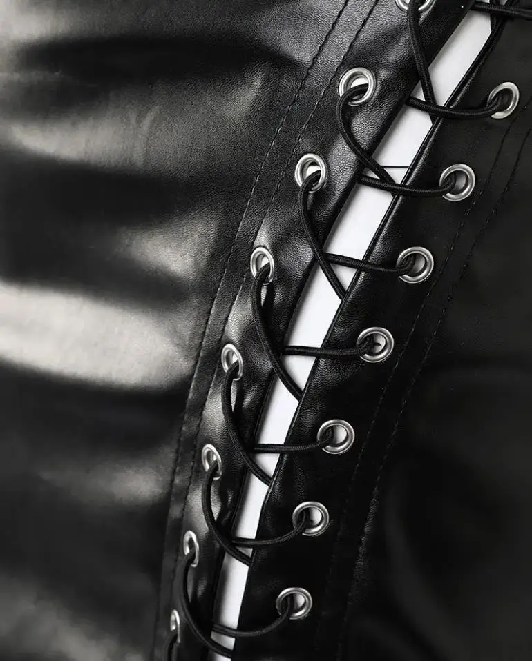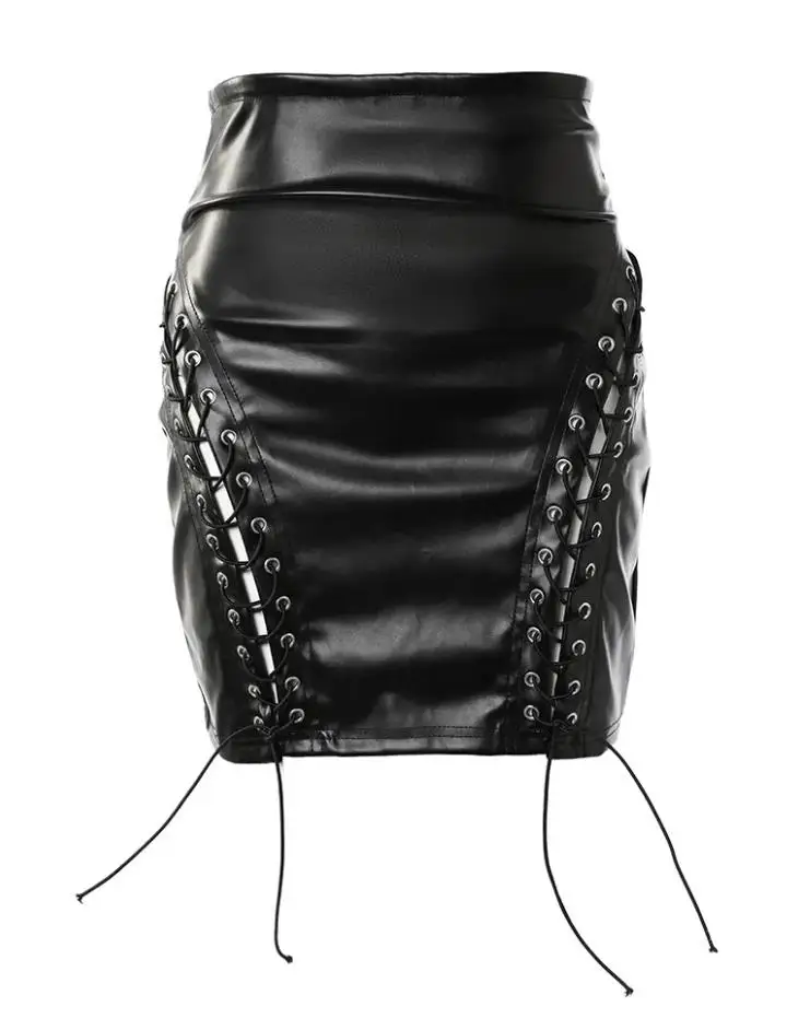 Falda de cuero, corta de cuero de cintura alta con cordones, ajustada a la cadera.