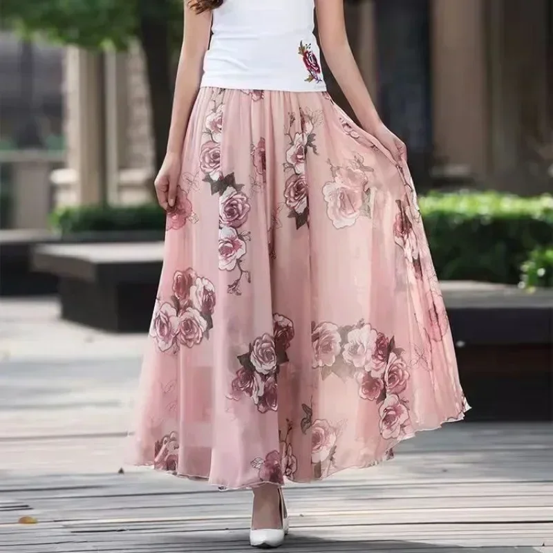 Falda larga Floral de gasa de cintura alta.Falda larga Floral de gasa de cintura alta.